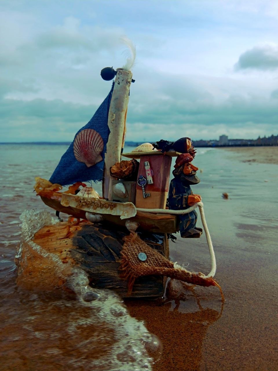Flat plane Fisherman, natural materials and shoreline drift material.