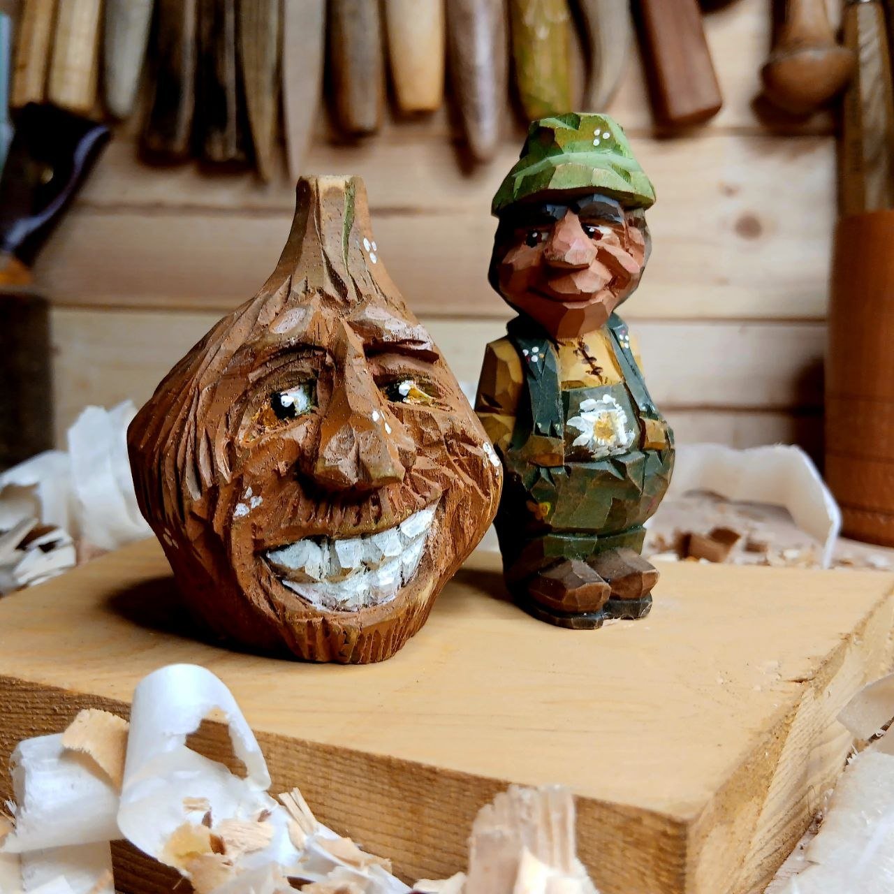 Flat plane figurine and miniature, in limewood (farmer) and jelutong (onion)